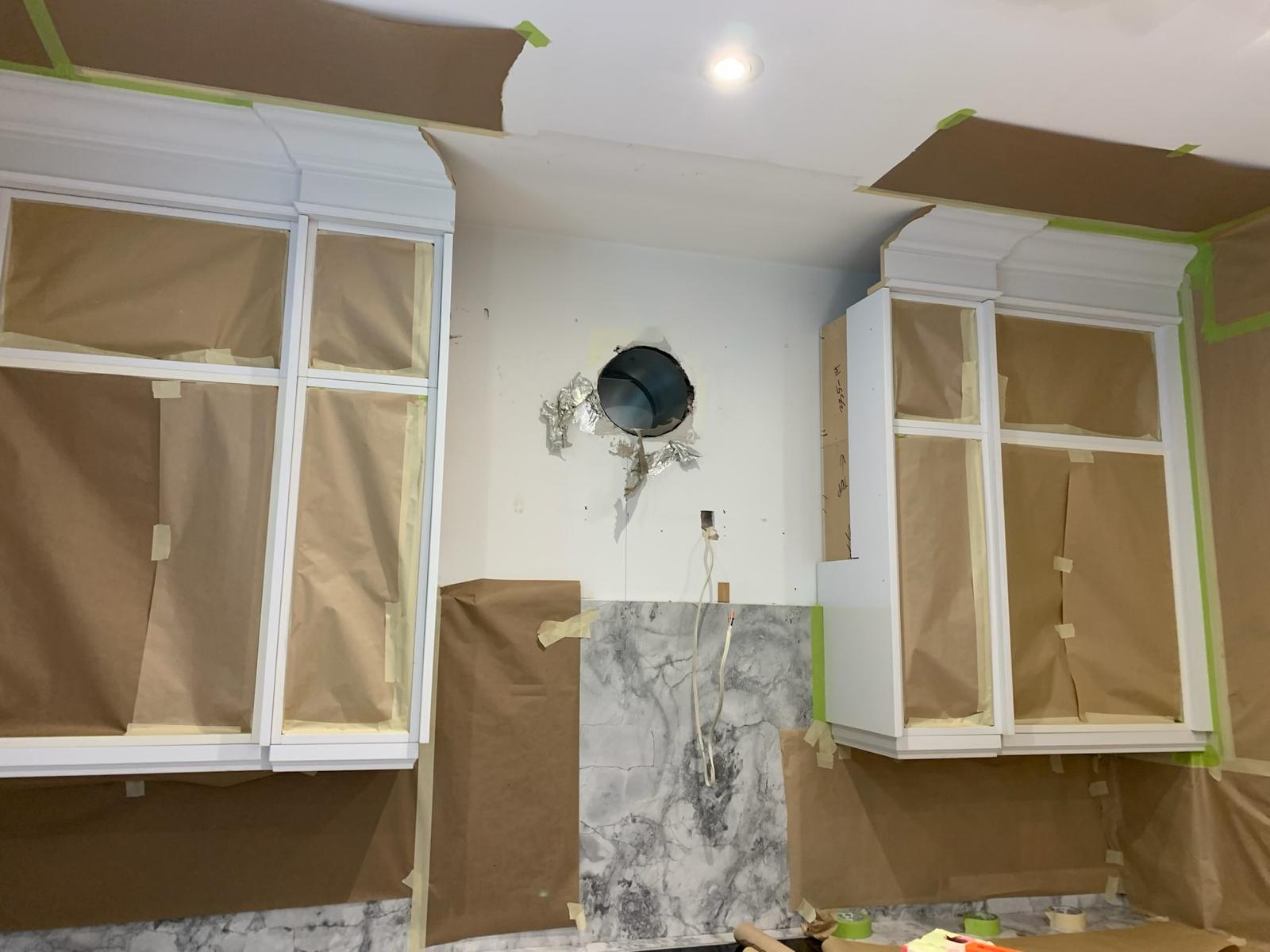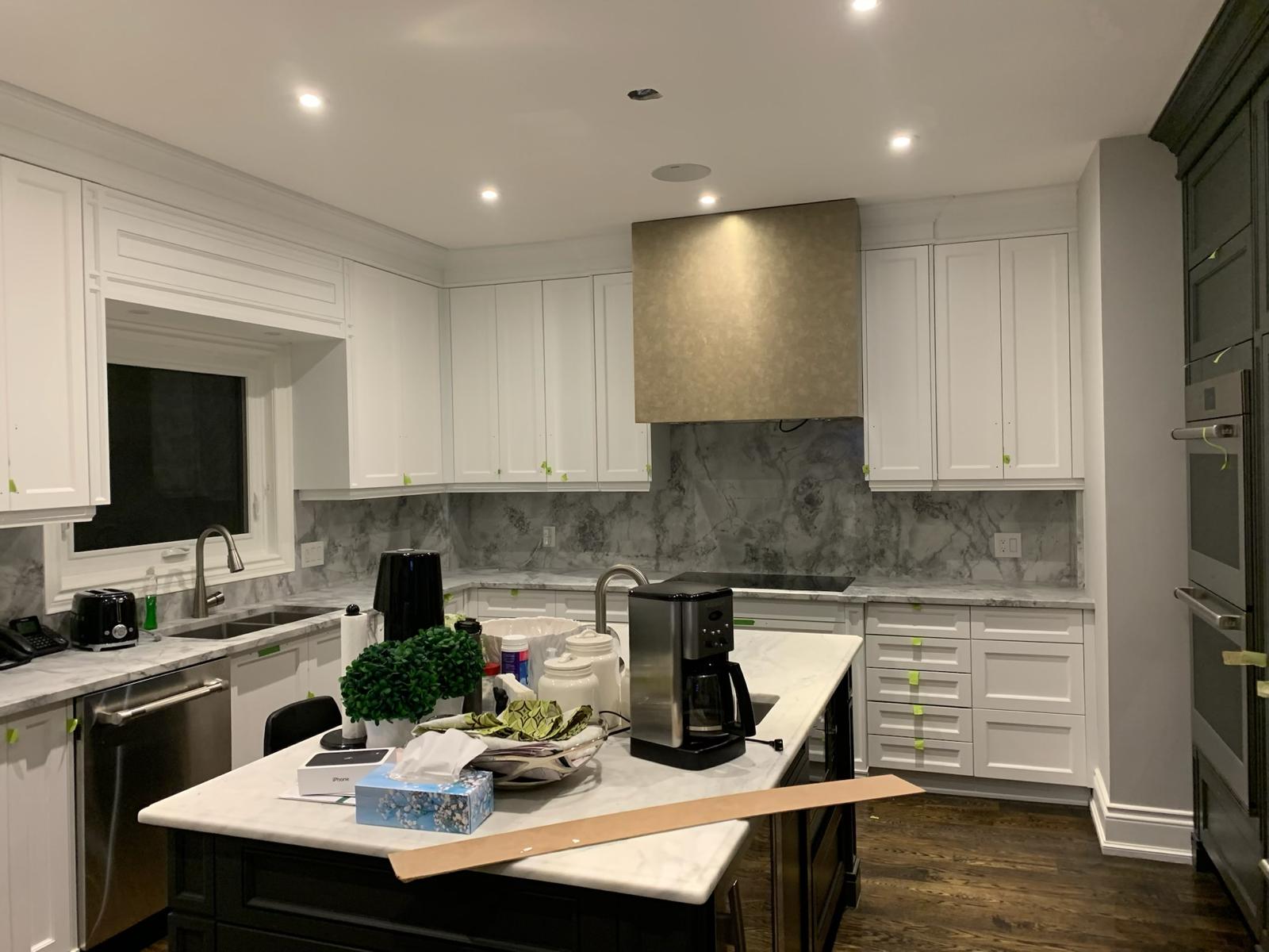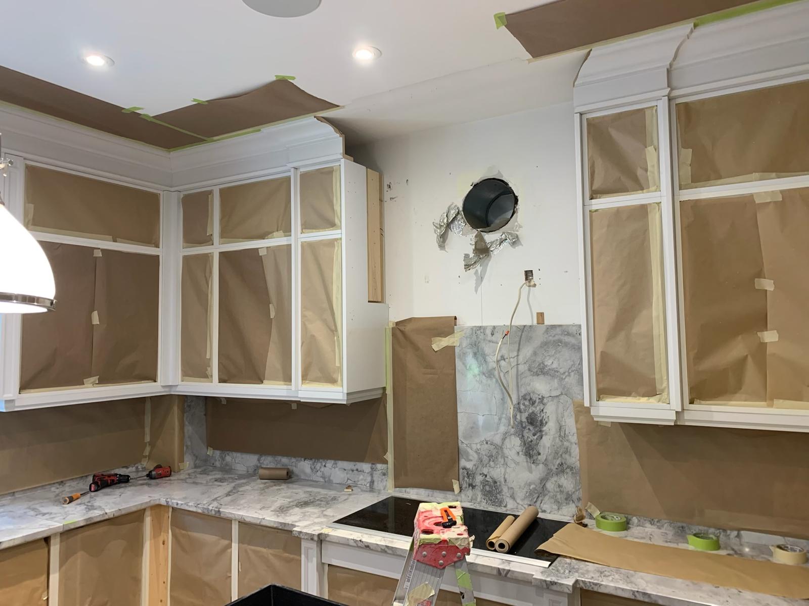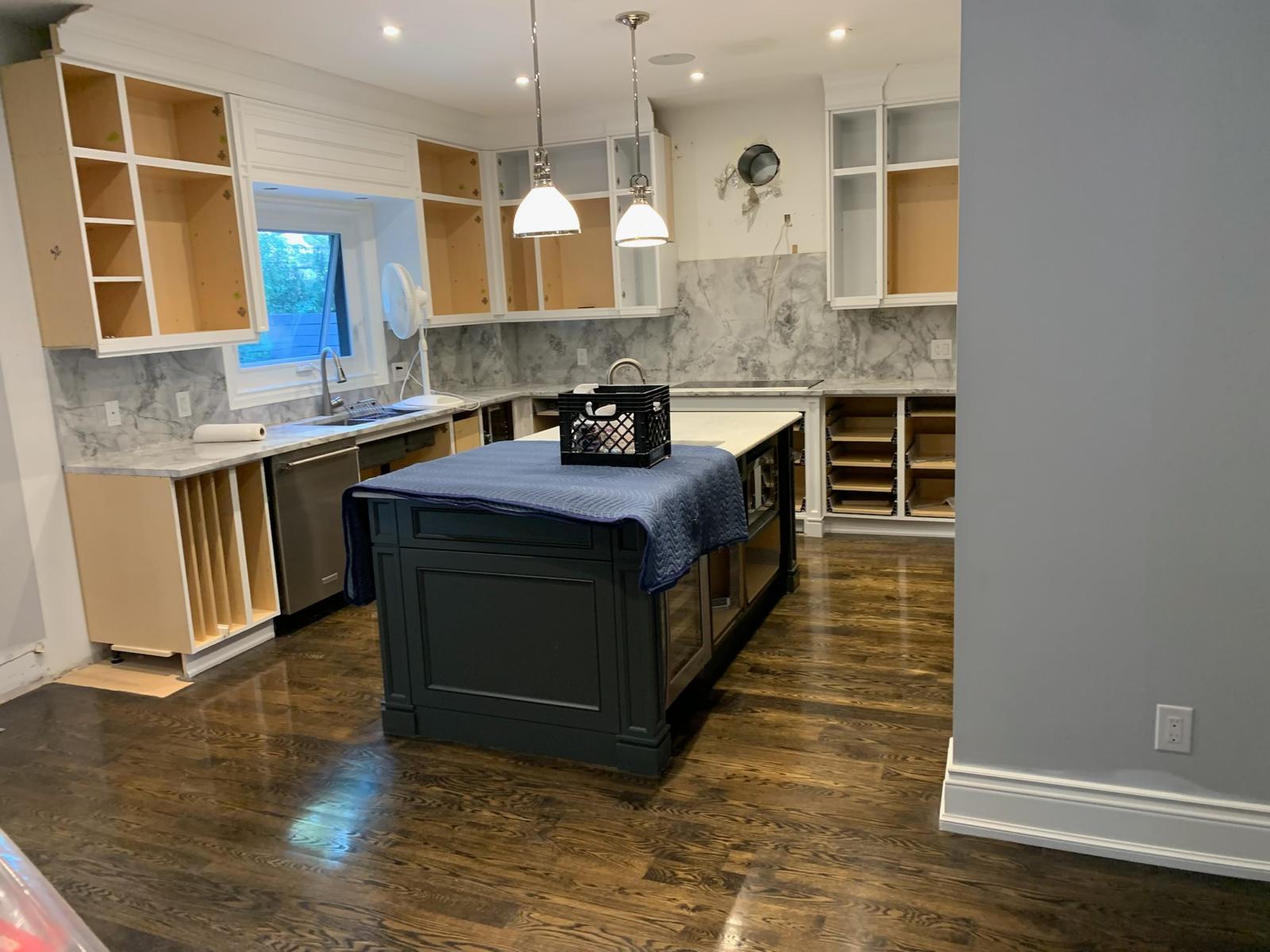 A high-end finish starts with expert preparation. Here, we’re installing custom side gables, elegant crown moulding, and a brand-new island to ensure every detail is perfectly aligned before the final transformation.