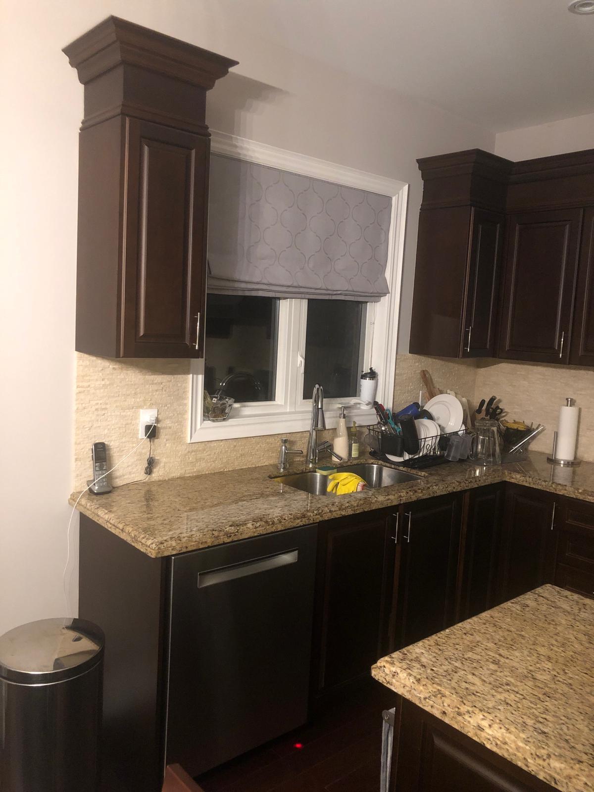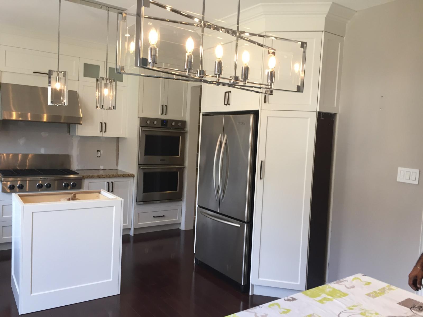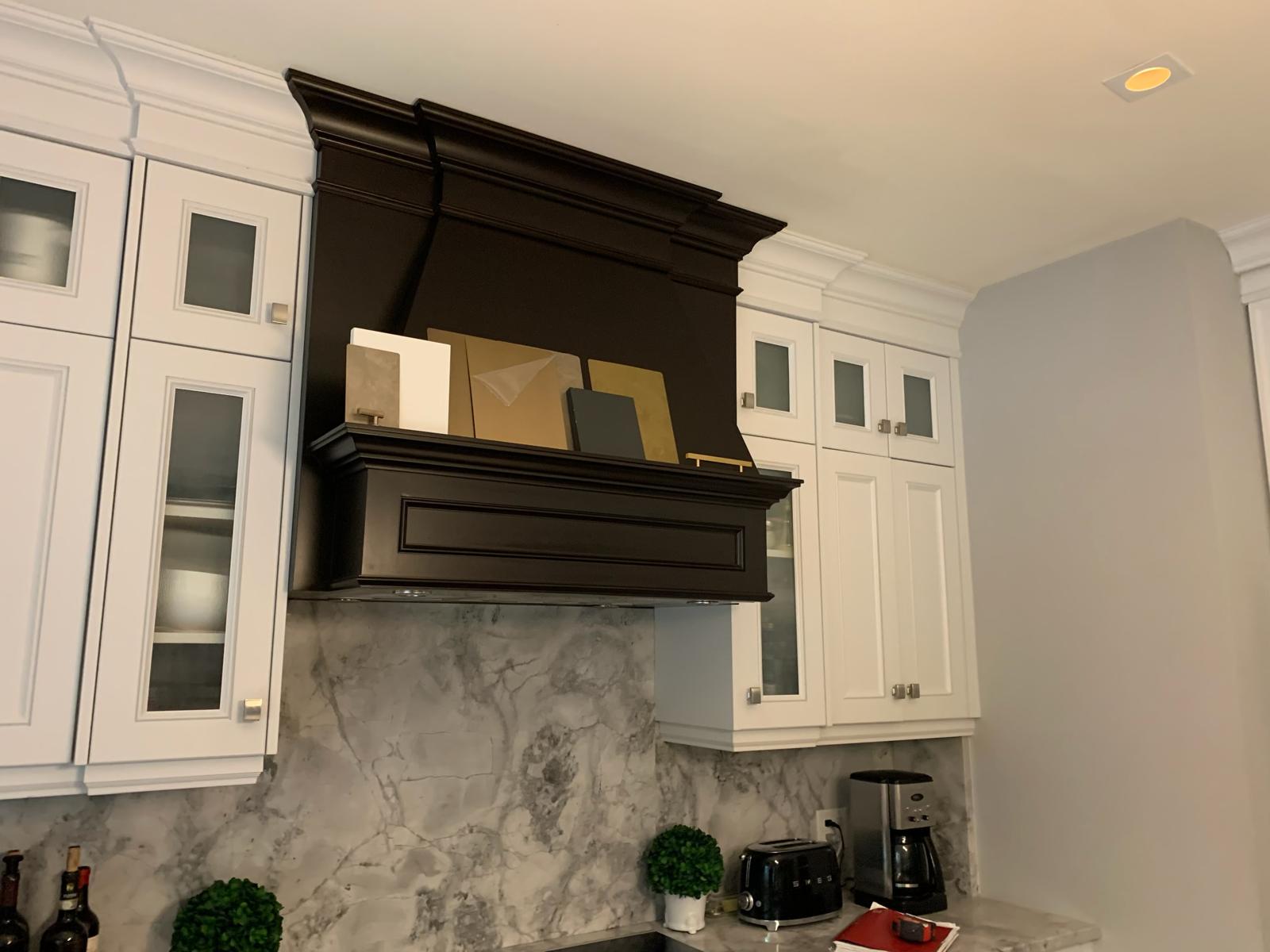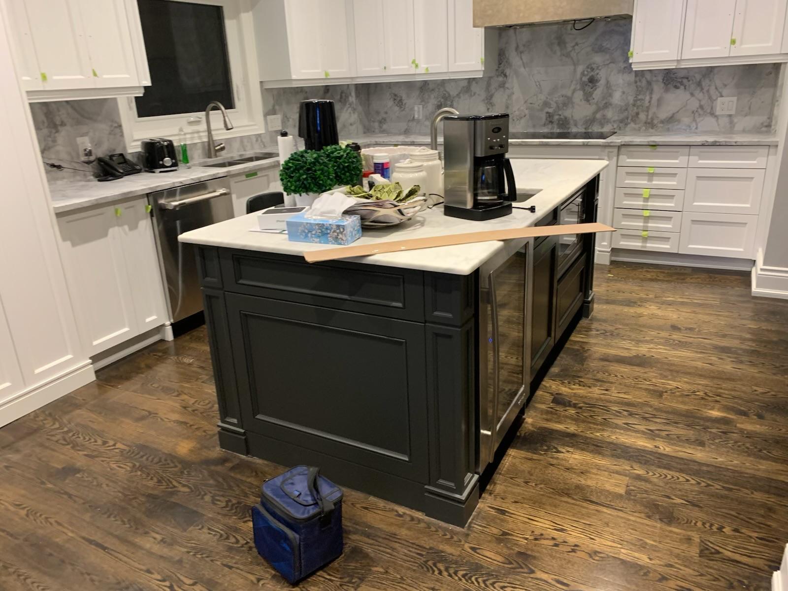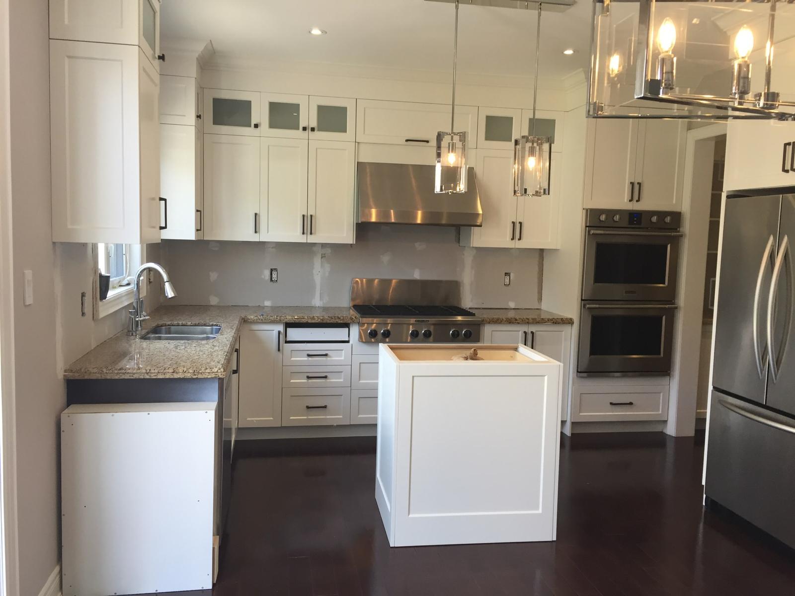 A high-end finish starts with expert preparation. Here, we’re installing custom side gables, elegant crown moulding, and a brand-new island to ensure every detail is perfectly aligned before the final transformation.