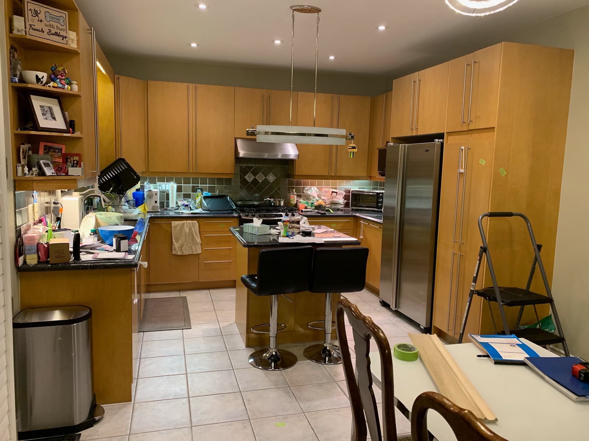 Beyond a new finish, we re-balanced this space by reconfiguring the fridge and oven housing, widening narrow cabinetry, and replacing dated double-stacked uppers with sleek, full-height doors. The final touch? Swapping the heavy wooden hood for modern stainless steel to create a perfectly balanced, dark-toned masterpiece.