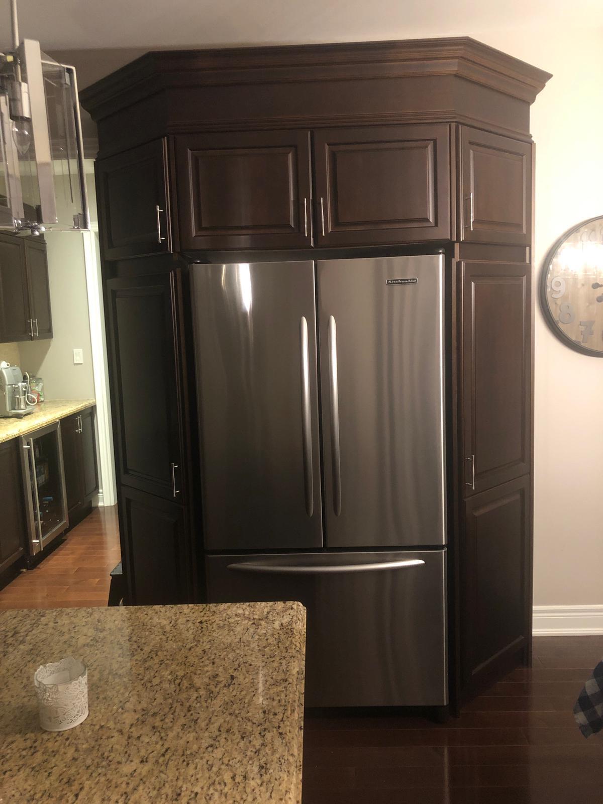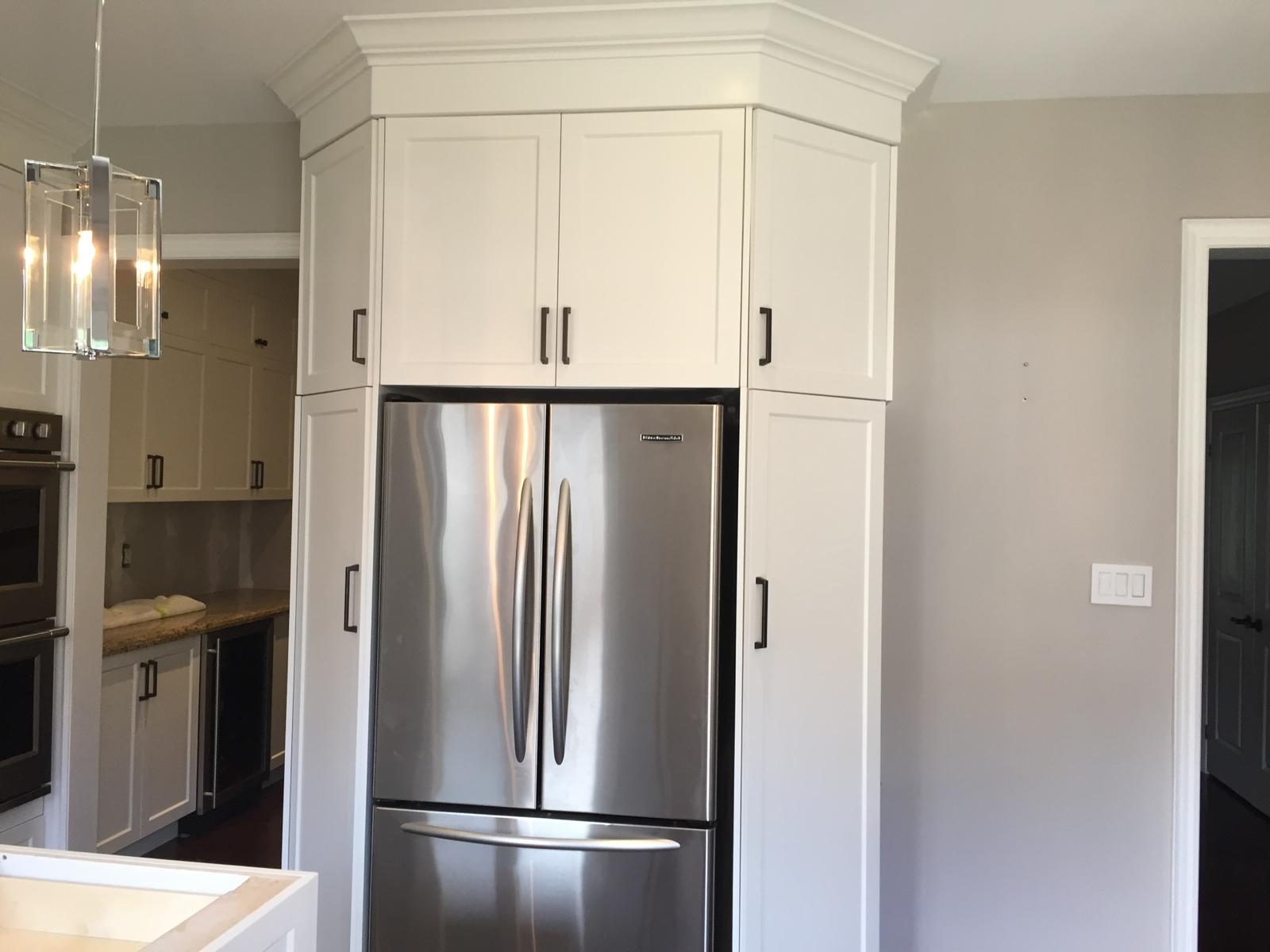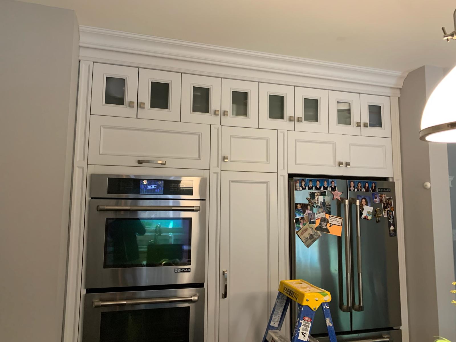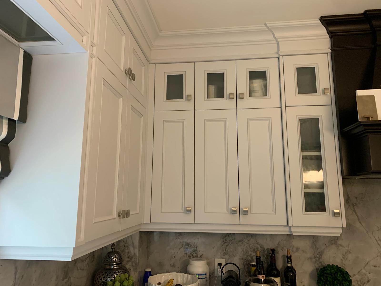 Experience the ultimate kitchen refacing. We replaced the old dark doors and crown moulding with a fresh white finish and modern door styles for a complete showroom-quality upgrade.